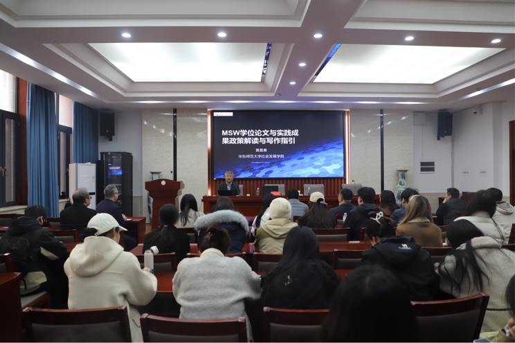11月28日上午九点,华东师范大学社会发展学院黄晨熹教授在博后楼三楼学术讲堂面向湖南师范大学社会工作全体研究生及老师开展了一场以“MSW学位论文与实践成果政策解读与写作指引”为主题的专题讲座。本次讲座由我院社会学系罗忠勇教授主持。讲座围绕社会工作专业学位论文的政策背景、培养要求、写作规范及创新路径等核心内容展开,为在场师生提供了系统性指导。