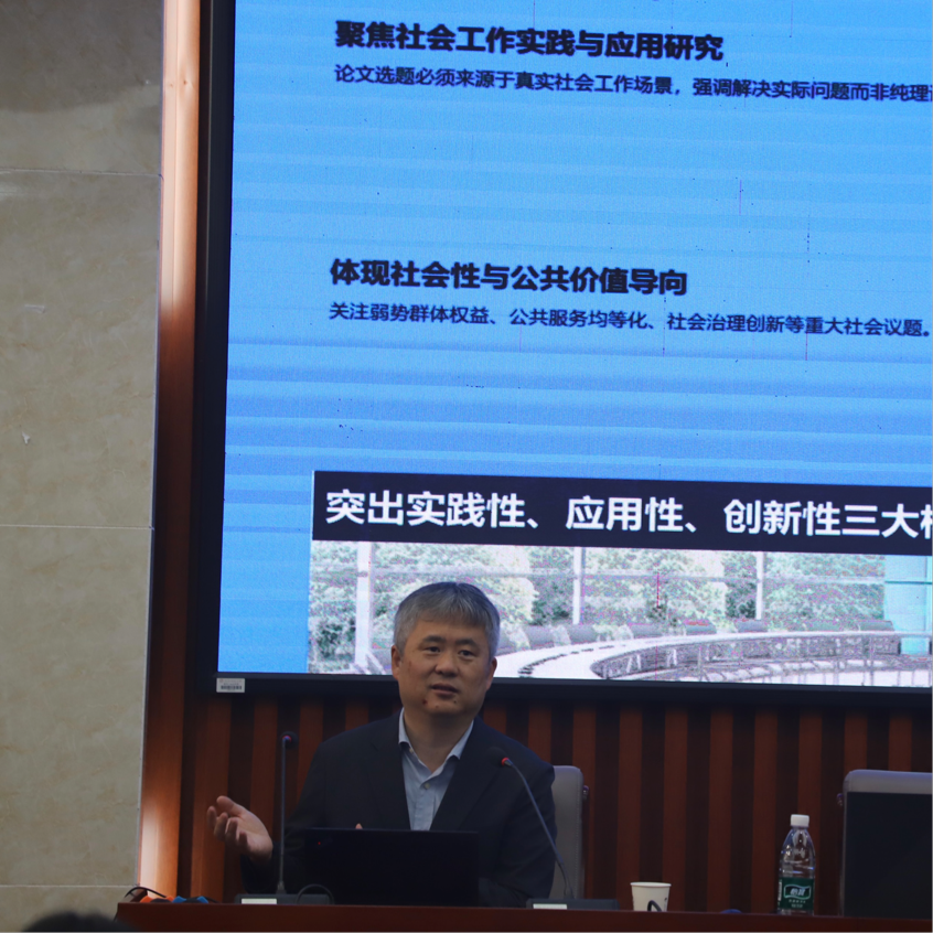黄晨熹教授首先解读了MSW(社会工作硕士)学位论文编制的政策依据,强调要严格遵循《中华人民共和国学位法》要求,落实国家学位制度与专业学位教育改革精神。他指出,社会工作专业人才培养需坚持“政治引领、问题导向与创新能力并重”的方向,注重解决复杂社会问题的能力训练,同时动态适应国家战略需求,推动社会工作理论与实务的自主创新。